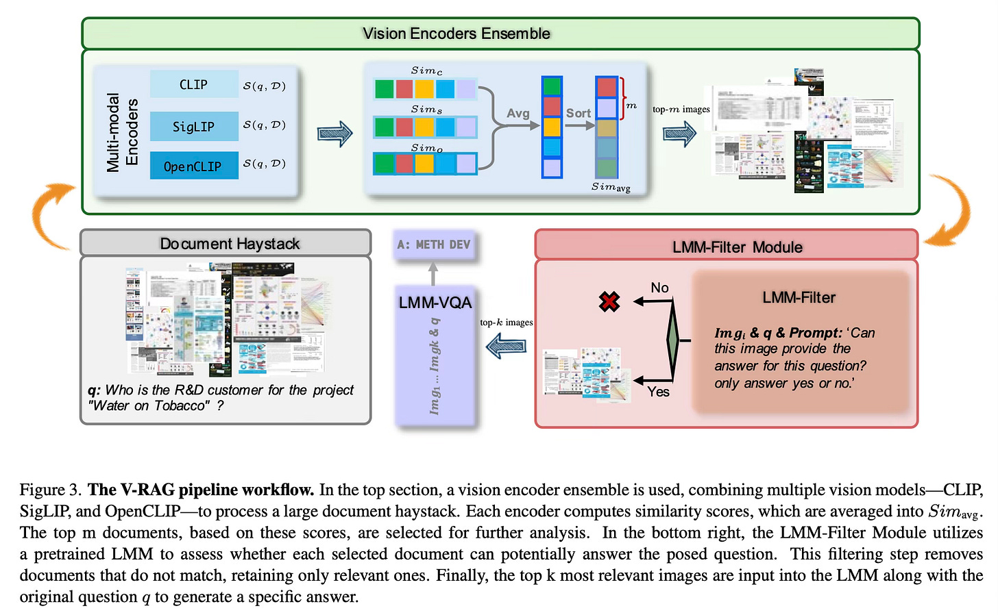 The paper introduces V-RAG, a framework that combines multiple vision encoders with a specialized filtering system to process large document collections efficiently. The method works in three main stages: first, it uses an ensemble of vision encoders (CLIP, SigLIP, and OpenCLIP) to analyze documents and compute similarity scores with the given question. Then, a language model-based filter evaluates the relevance of the top-ranked documents to refine the selection. Finally, the most relevant documents are passed to a large multimodal model for generating the final answer.