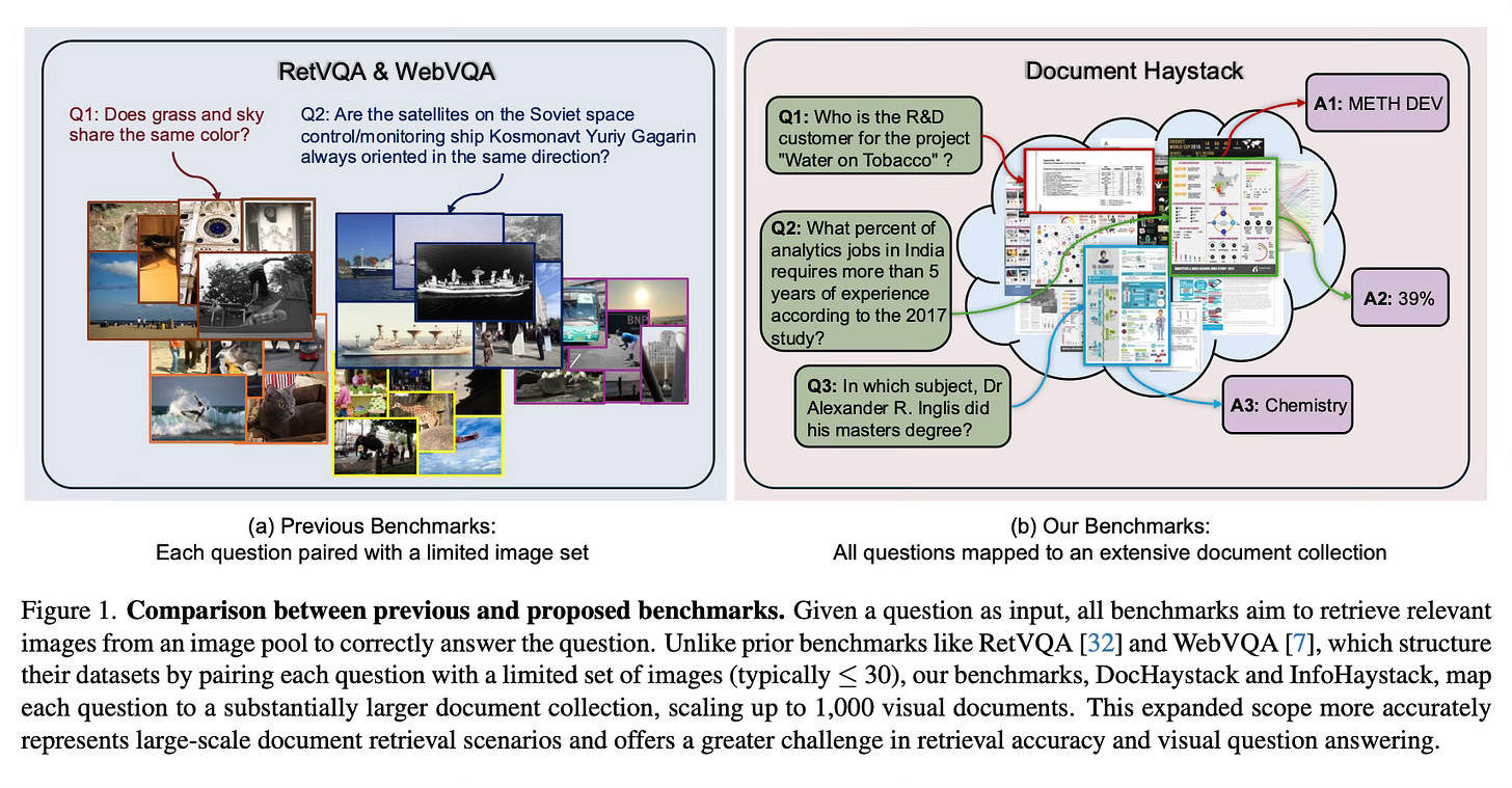 Today's paper introduces DocHaystack and InfoHaystack, two new benchmarks designed to evaluate large multimodal models (LMMs) on their ability to retrieve and reason across extensive document collections. The paper addresses a critical gap in current benchmarks, which typically limit questions to small sets of images, by scaling up to 1,000 documents per question. Additionally, it presents V-RAG, a vision-centric retrieval-augmented generation framework that significantly improves retrieval accuracy and reasoning capabilities across large document collections.