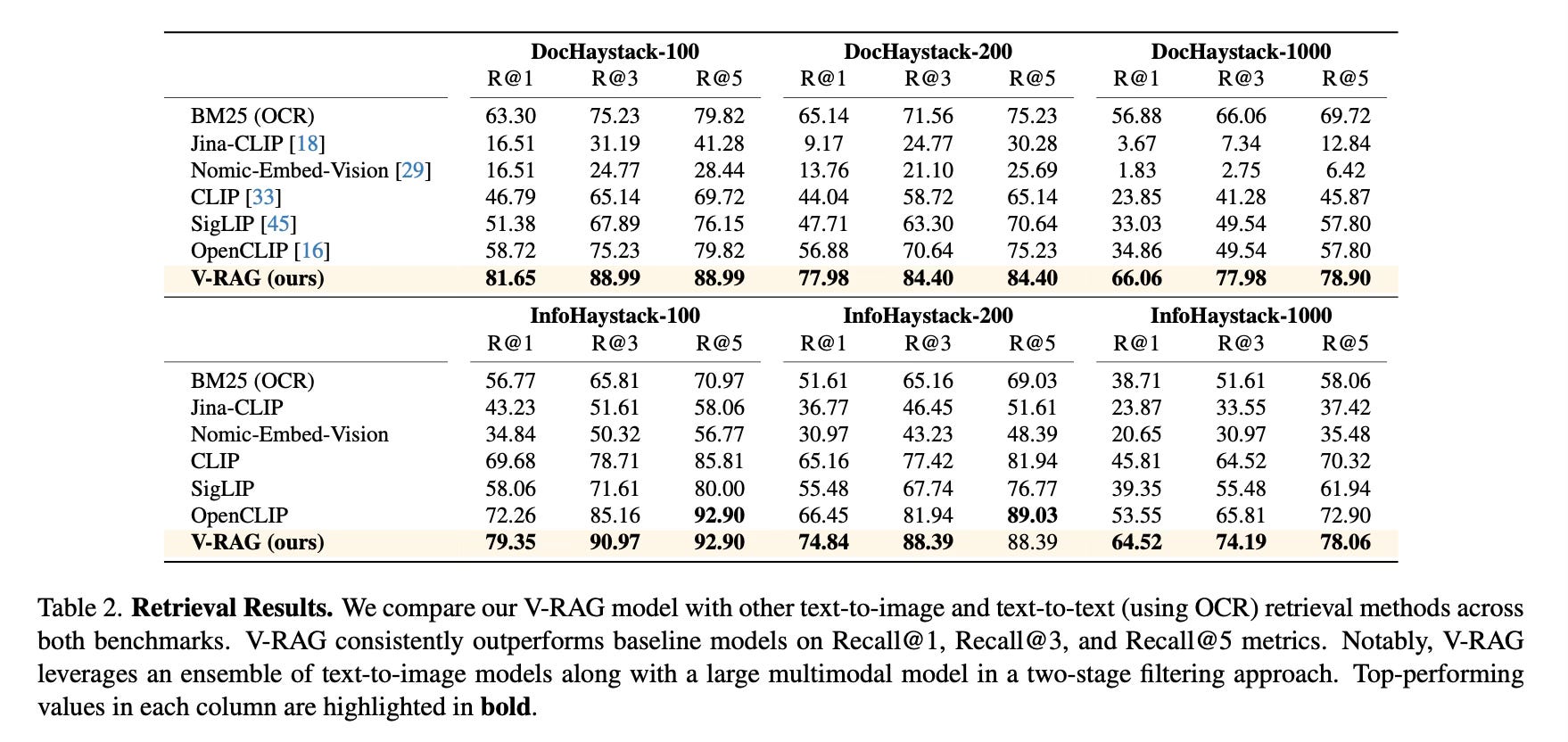 The paper successfully addresses the challenge of large-scale document retrieval and understanding through two key contributions: comprehensive benchmarks that better reflect real-world scenarios, and an effective framework for handling large document collections. The V-RAG framework shows that combining multiple vision encoders with strategic filtering can significantly improve performance on complex document retrieval and understanding tasks. For more information please consult the full paper.