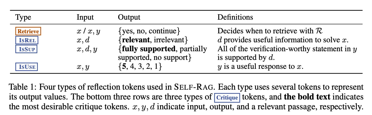 SELF-RAG introduces a new approach to enhance LLM generation quality and factuality through on-demand retrieval and self-reflection using special reflection tokens. For more information please consult the full paper.