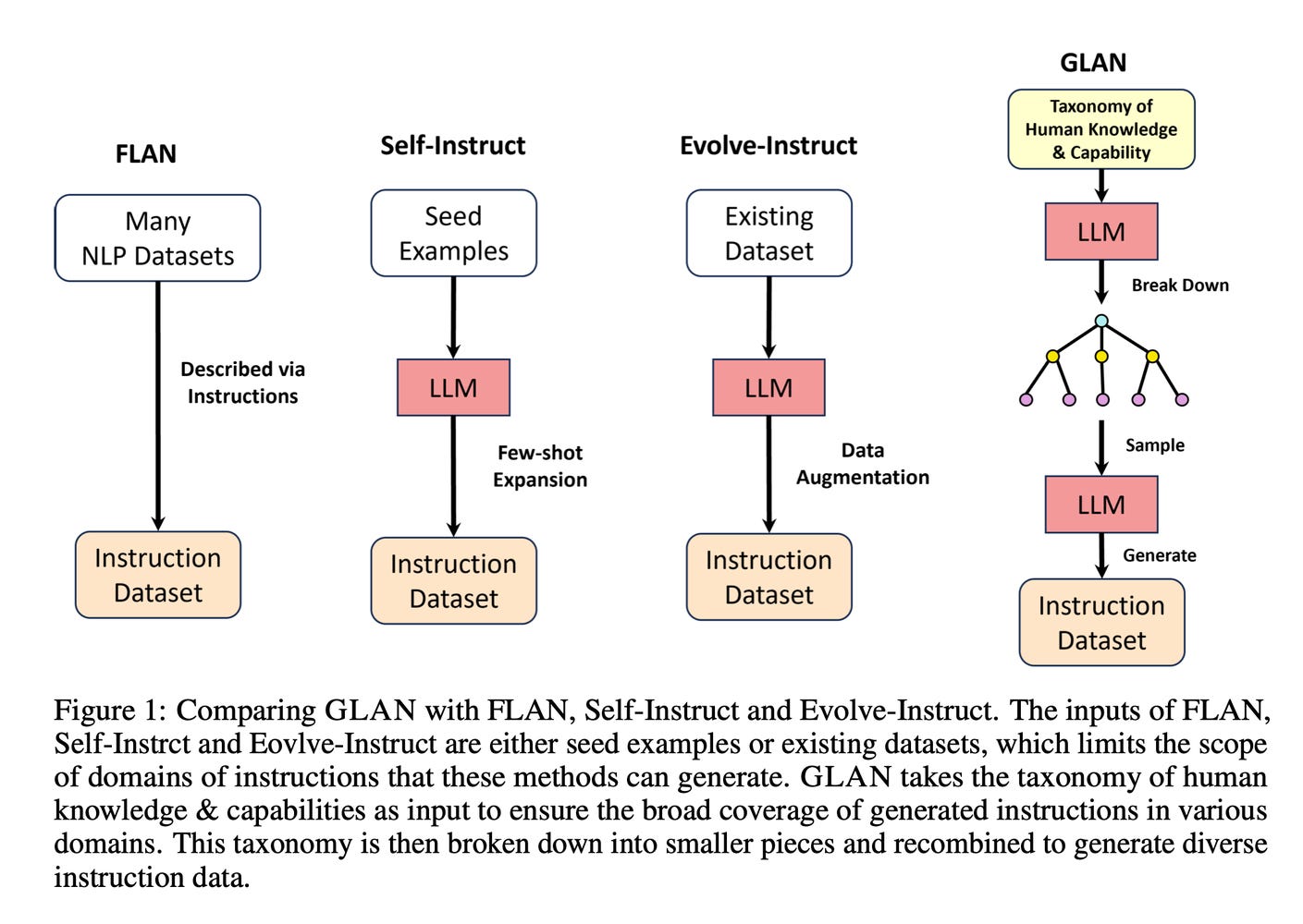 GLAN constructs a taxonomy of human knowledge, breaks it down into disciplines, subjects, and key concepts, and then uses this structured information to generate diverse and comprehensive synthetic instruction data for tuning LLMs. Below you can find a comparison between GLAN and other methods from literature: