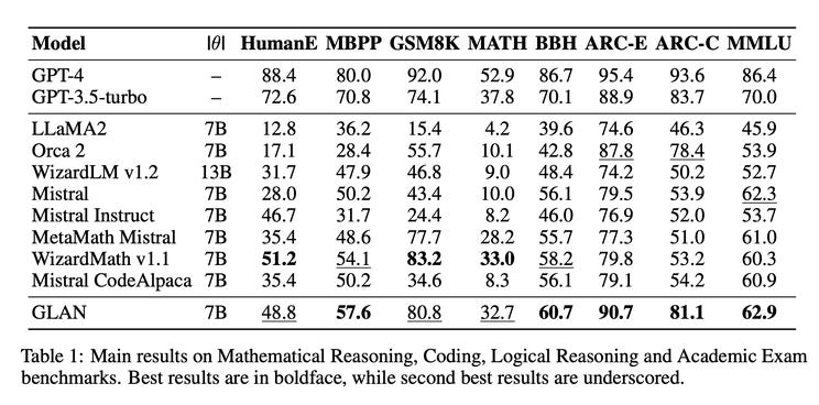 Extensive experiments demonstrate that GLAN significantly enhances the base LLMs' performance across various tasks, including mathematical reasoning, coding, logical reasoning, and general instruction following, without using task-specific training data. In the experiments, the authors use a Mistral-7B model. Here are the results: