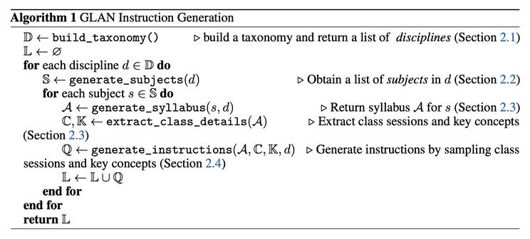 GLAN utilizes LLMs like GPT-4 to create a comprehensive taxonomy of human knowledge, organizing it into fields, sub-fields, and disciplines. This taxonomy guides the autonomous generation of subjects for each discipline, then a syllabus for each subject, outlining key concepts and class sessions. Then, GPT-4 is prompted to generate homework questions based on these elements. This methodical breakdown from broad disciplines to atomic-level components like class sessions and key concepts helps generating a comprehensive set of synthetic instruction data that is used for training/fine-tuning of other models. The process is formalized below:
